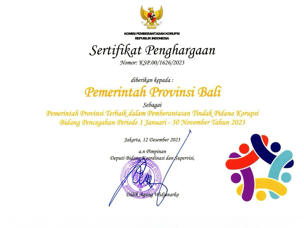 Kamis, 21 Desember 2023 bertempat di Jaya Sabha rumah jabatan Gubernur Bali dilaksanakan Pemberian Penghargaan Capaian MCP Tahun 2023.