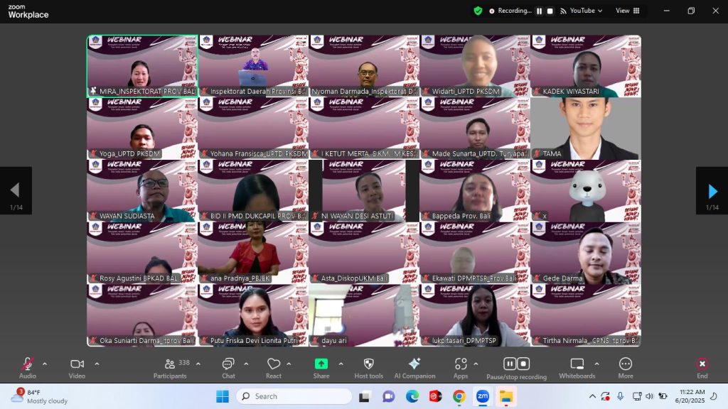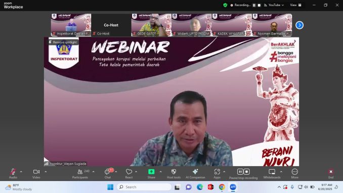 Jumat, 20 Juni 2025 bertempat di Ruang Rapat Sabha Adhyasta Pratama Kantor Inspektorat Daerah Provinsi Bali, dilaksanakan Webinar Pencegahan Korupsi melalui Tata Kelola Pemerintahan Daerah secara daring via zoom meeting.